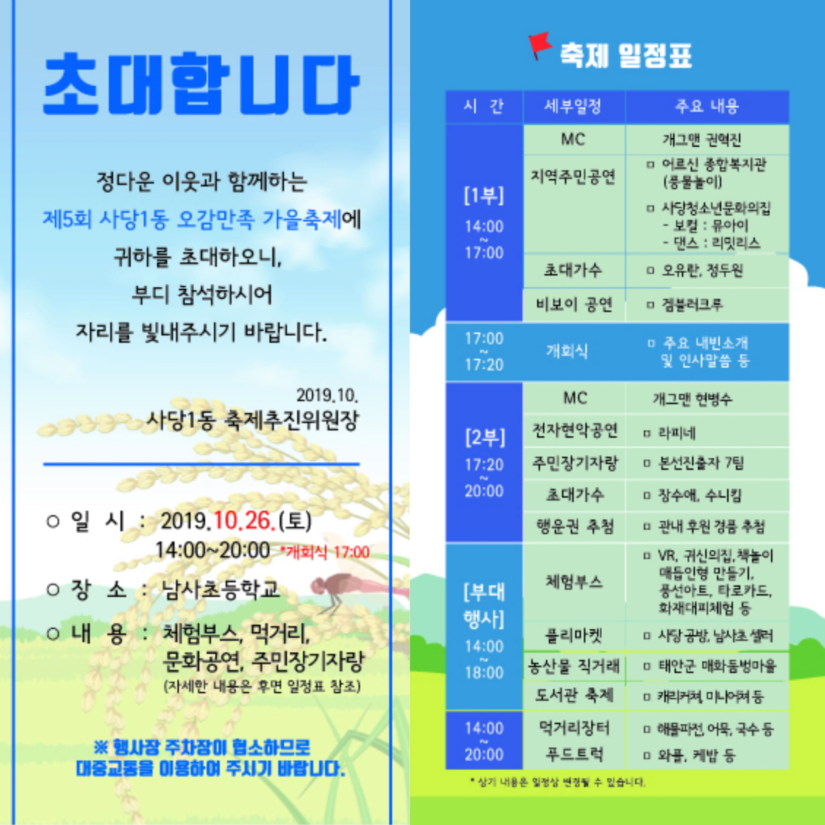 선선한 가을바람이 솔솔 부는 놀러가기 좋은 가을~~사당1동에서 여러분들의 오감을 만족시킬 <정다운 이웃과 함께하는 오감만족 가을축제>가 열립니다.가족들과, 친구들과, 이웃들과 즐거운 시간을 보내기 위해 사당1동 남사초등학교로 놀러오세요*^^*