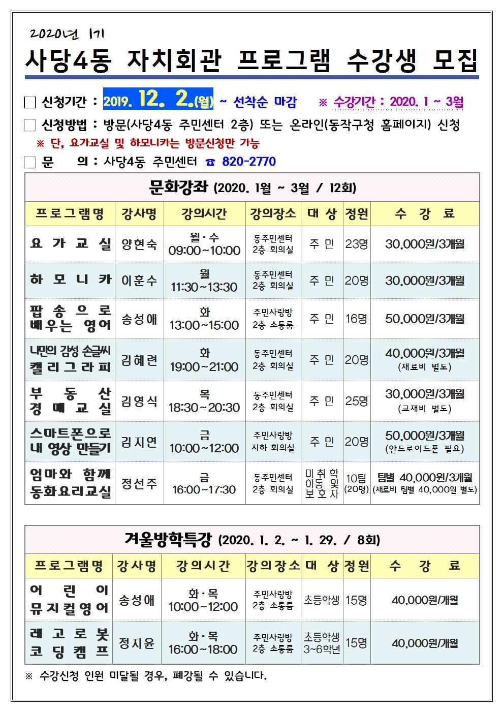 2020년 1기 사당4동 자치회관프로그램 수강생 모집 (팝송영어, 스마트폰영상, 캘리그라피, 부동산경매, 동화요리, 뮤지컬영어, 레고로봇코딩, 요가, 하모니카)