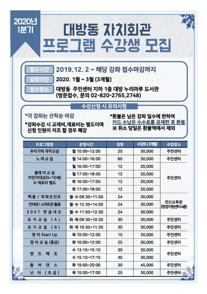 2020년 1분기 대방동 자치회관 프로그램 수강 접수 안내(2019.12.2(월) ~ 선착순마감)