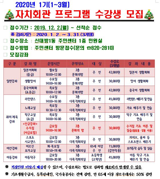 2020. 1기 신대방1동 자치회관 프로그램 접수 안내