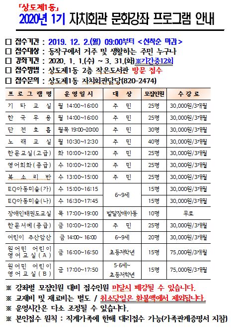 2020. 1기 자치회관 문화강좌 프로그램 접수 안내(선착순 마감)