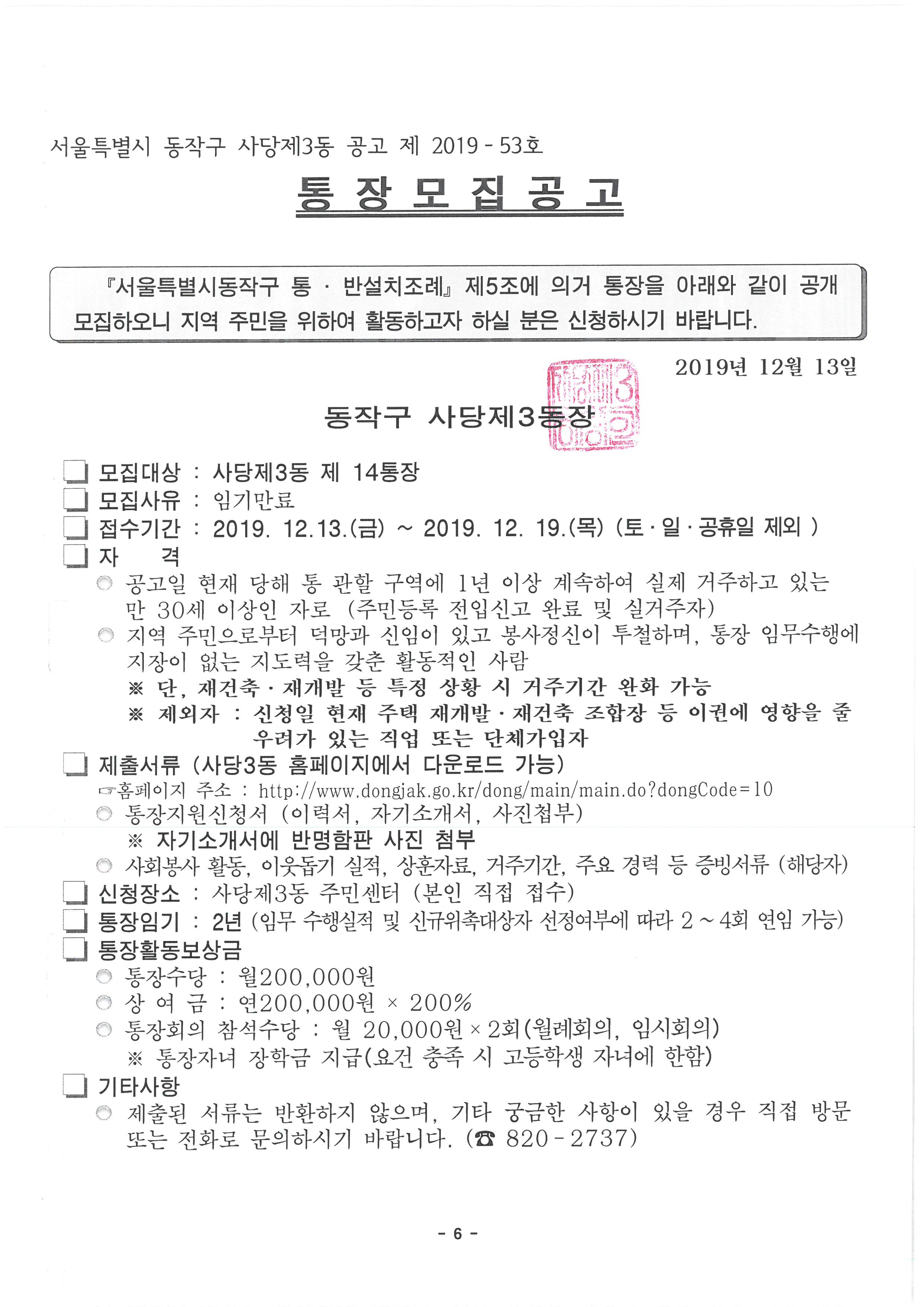 서울특별시 동작구 통· 반 설치조례 제5조에 의거 우리동 통장을 붙임과 같이공개 모집하오니 지역 주민을 위하여 활동 하실 분은 첨부문서를 참고하여 신청하시기 바랍니다.