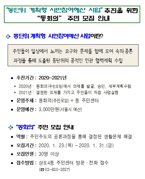상도4동 "동단위 계획형 시민참여예산 사업" 추진을 위한 "동회의" 주민모집 안내