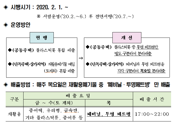 폐비닐·페트병 분리배출 요일제(木) 시행 안내