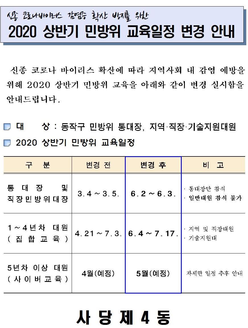 신종 코로나바이러스 감염증 확산 방지를 위한 2020 상반기 민방위 교육일정 변경 안내