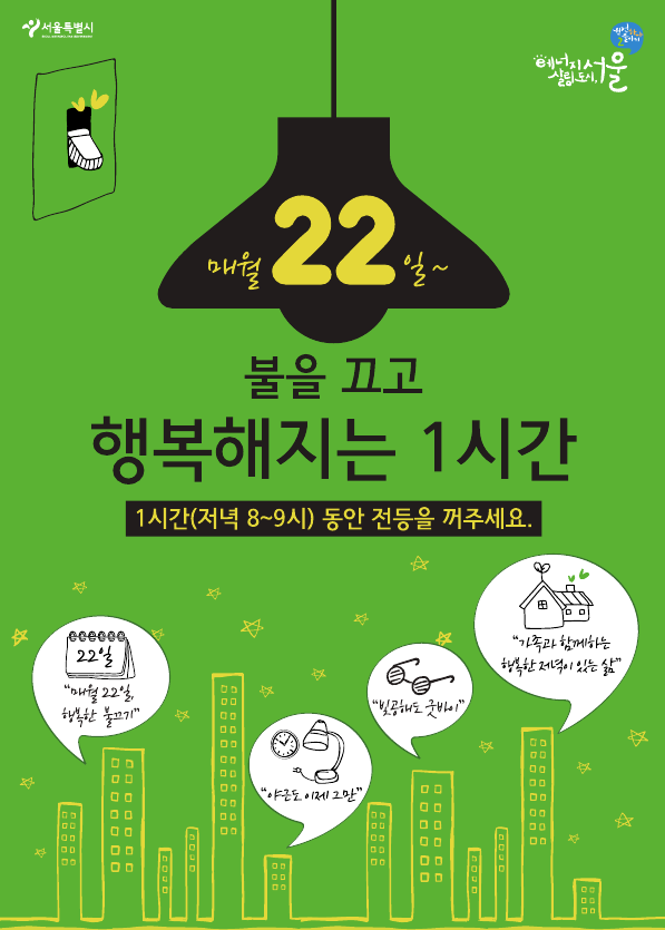 서울시에서는 생활 속 에너지 절약을 위한 범시민실천운동으로 연중 매월 22일 저녁 1시간(20시 ~ 21시) 전등을 소등하는 「행복한 불끄기의 날」 캠페인을 추진하고 있습니다. 에너지 절약의 필요성에 대한 공감대를 형성하고, 솔선수범하여 실천하는 것이 무엇보다 중요하오니, 적극 동참하여 주시기 바랍니다.