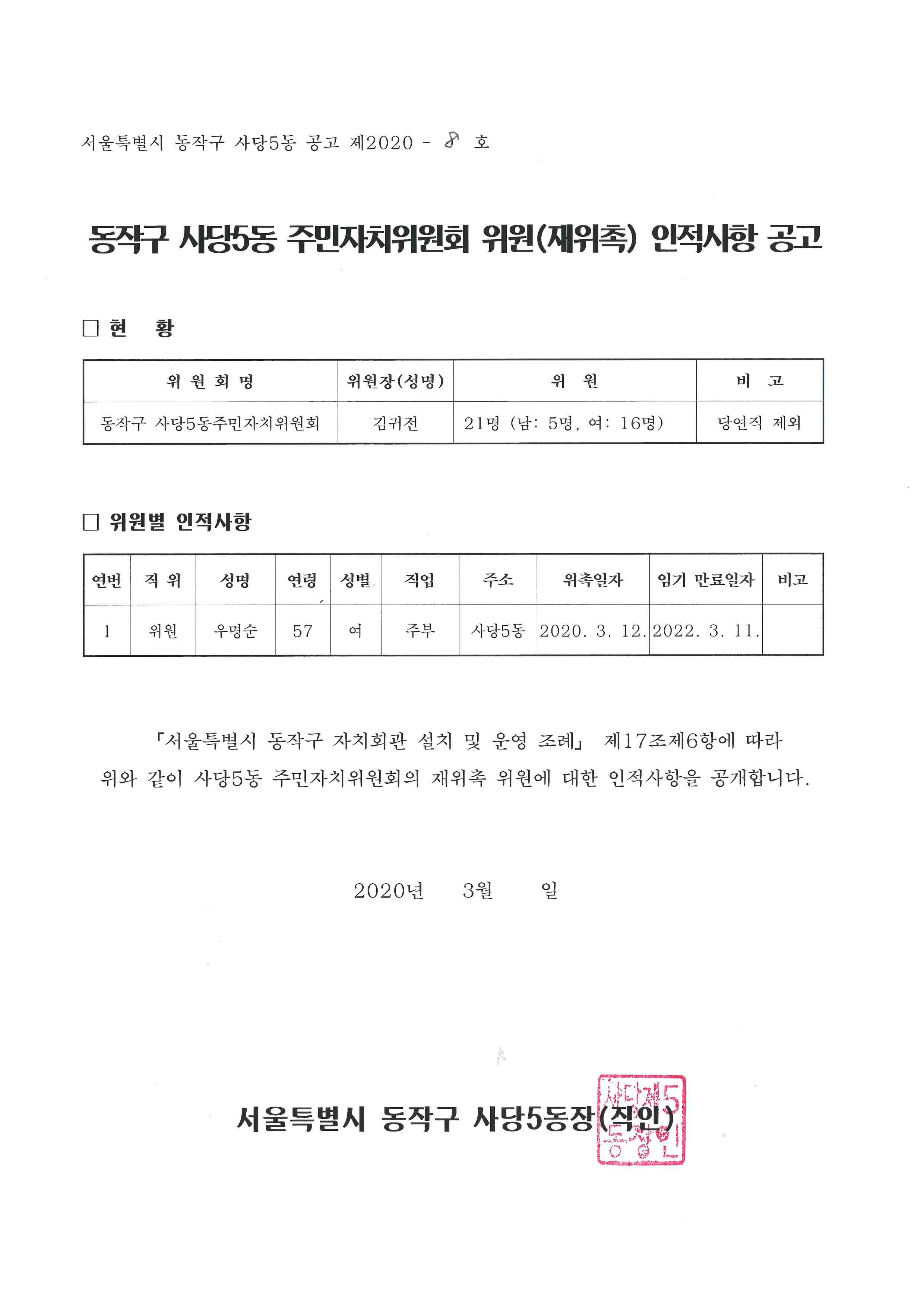 서울특별시 동작구 자치회관 설치 및 운영 조례 제17조(구성 등) ⑥에 따라 우리동 주민자치위원회 (재위촉)위원 인적사항을 아래와 같이 공고합니다.