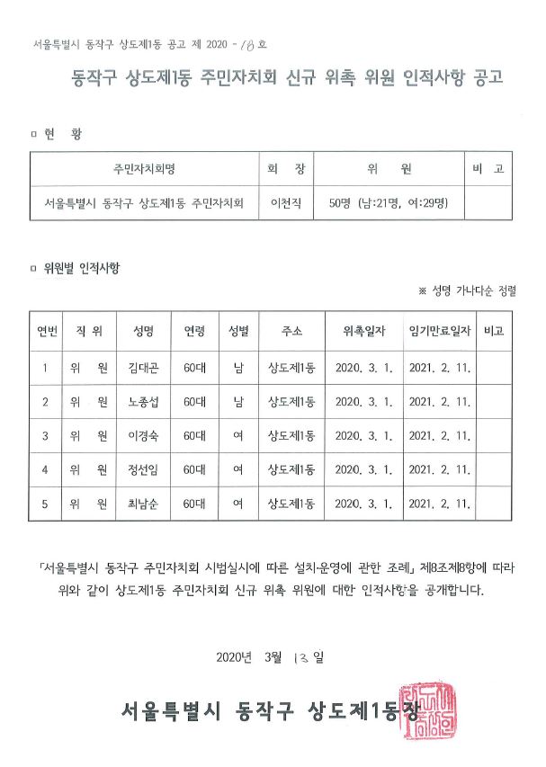 상도1동 주민자치회 신규위촉위원 인적사항 공고