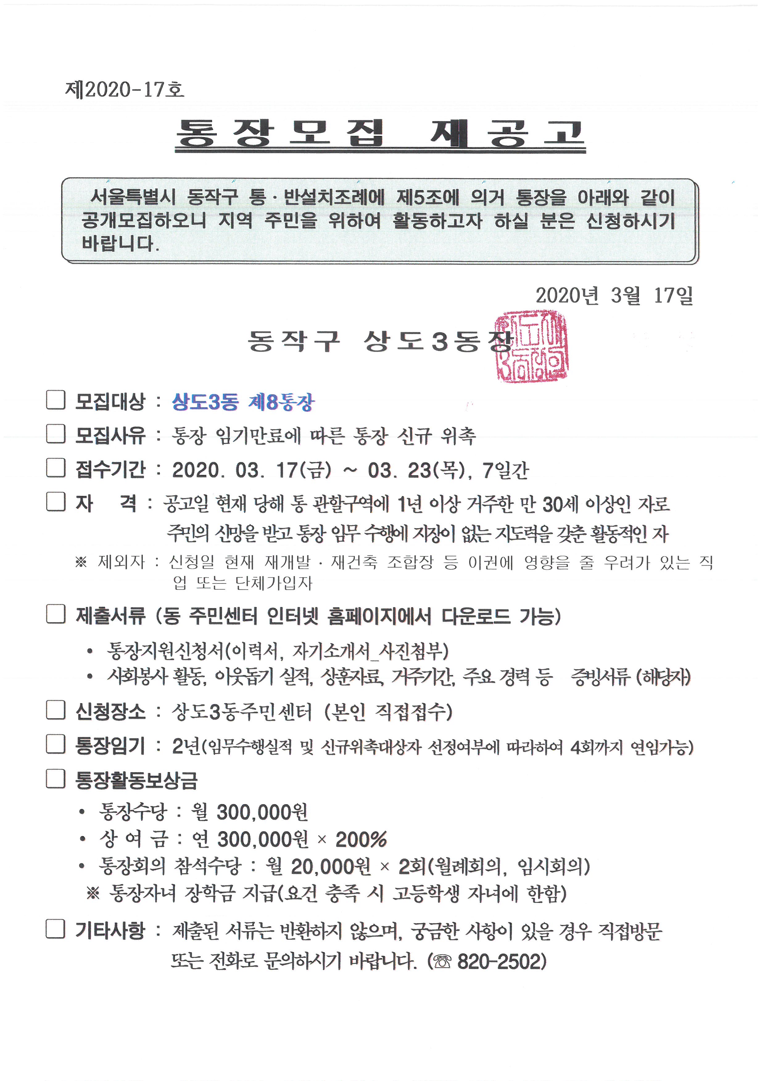 상도3동 통장 공개모집 재공고(8통)