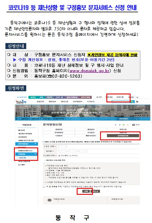 이 문자서비스를 제공 받고자하시는 주민께서는 동작구청 홈페이지를 통해 신청하시기 바랍니다.