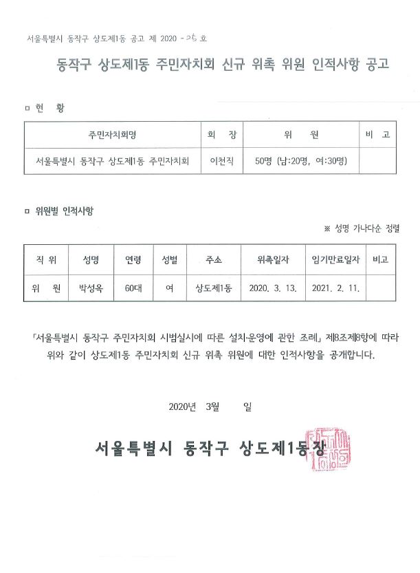 상도제1동 주민자치회 신규 위촉위원 인적사항 공고