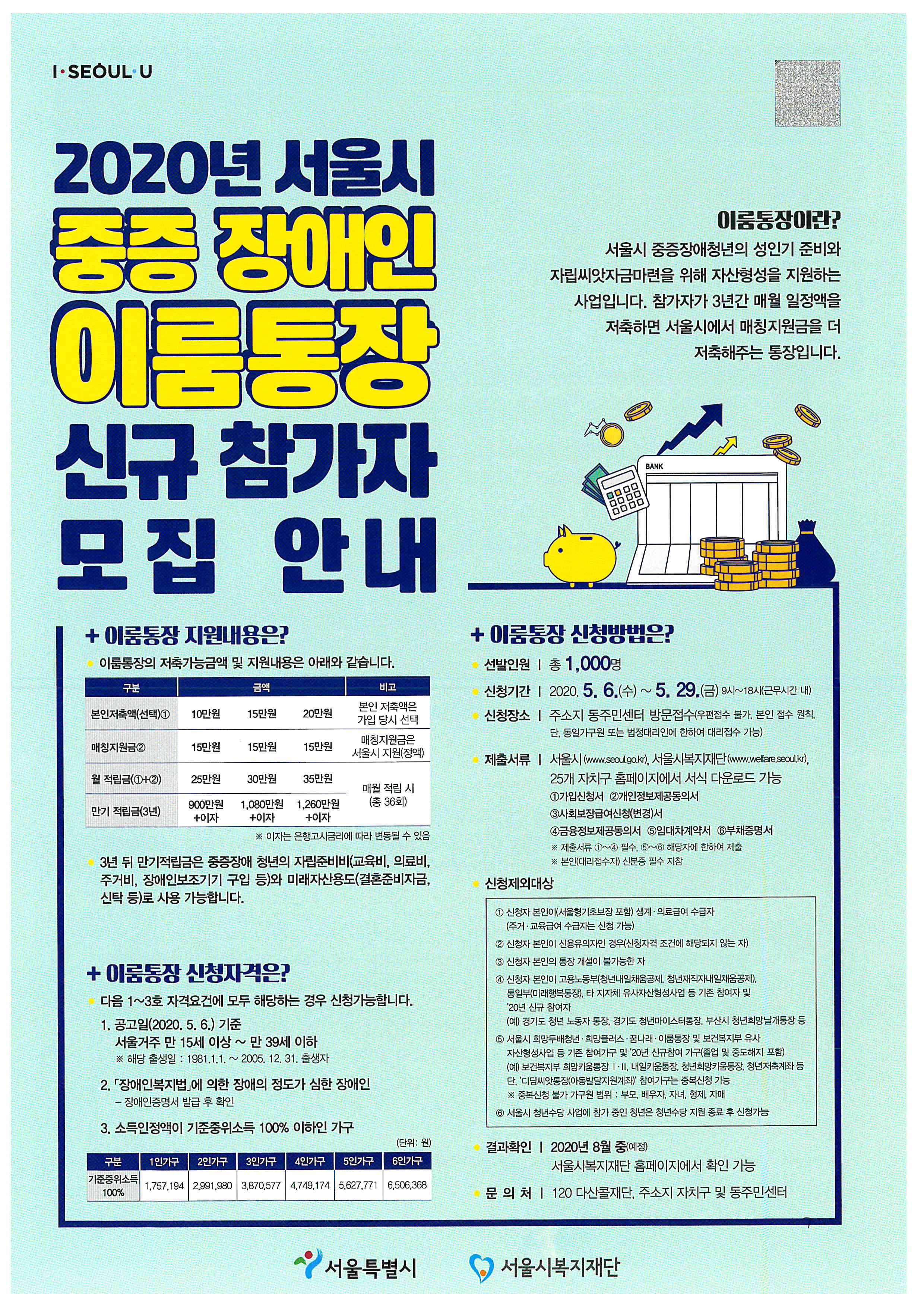 2020년 「서울시 중증장애인 이룸통장」 신규 참가자 모집