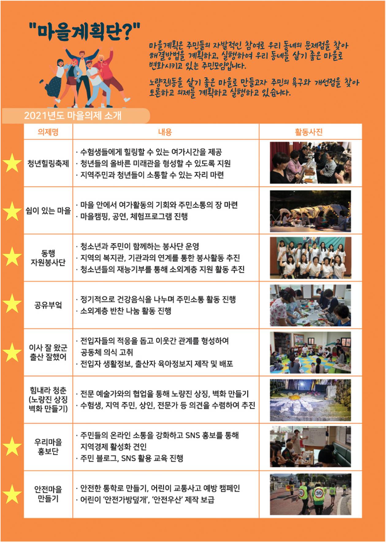 마을총회 주민투표 결과, 힘내라 청춘(노량진 상직 벽화 만들기)를 제외하고 7개의 의제가 선정되었습니다.
