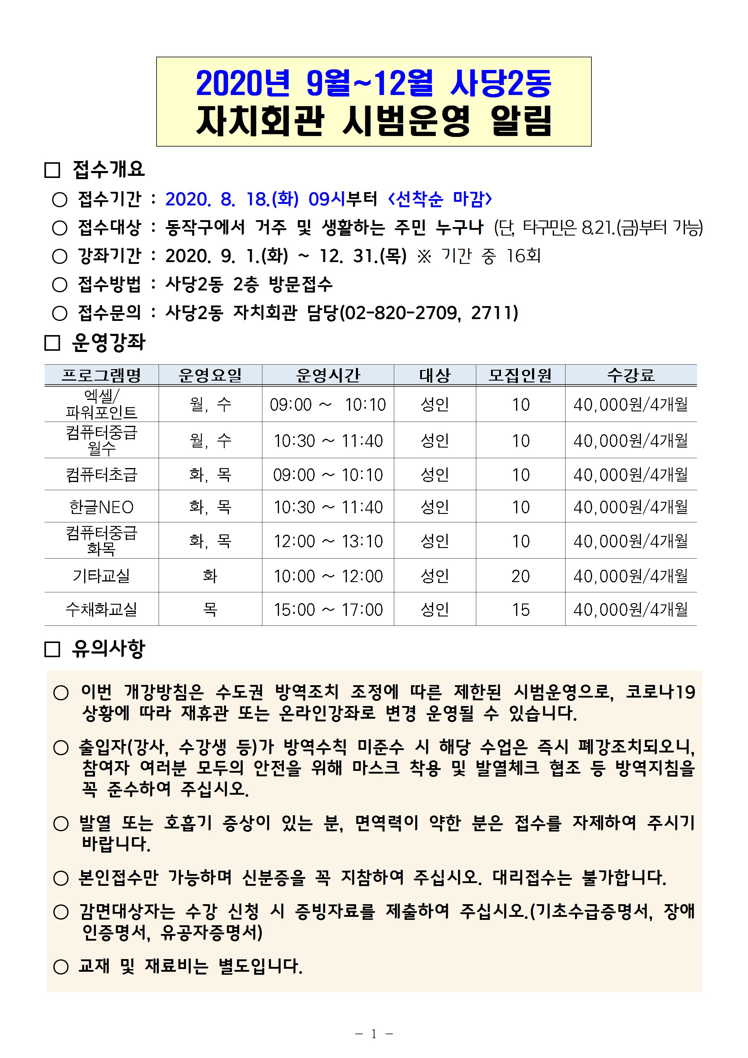 2020.9~12월 사당2동 자치회관 프로그램 시범운영 안내