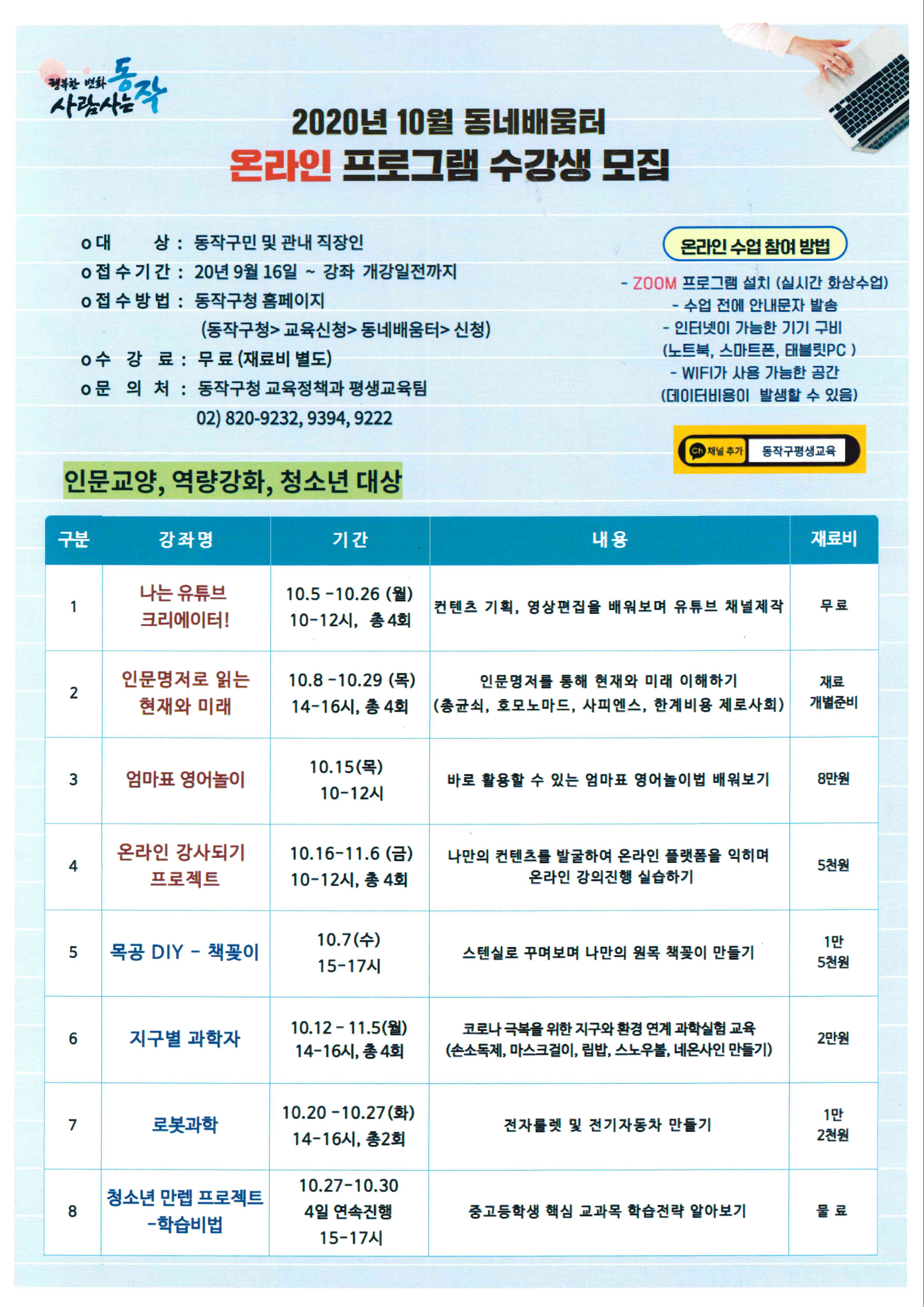 2020. 10월 온라인 동네배움터 프로그램 수강생 모집