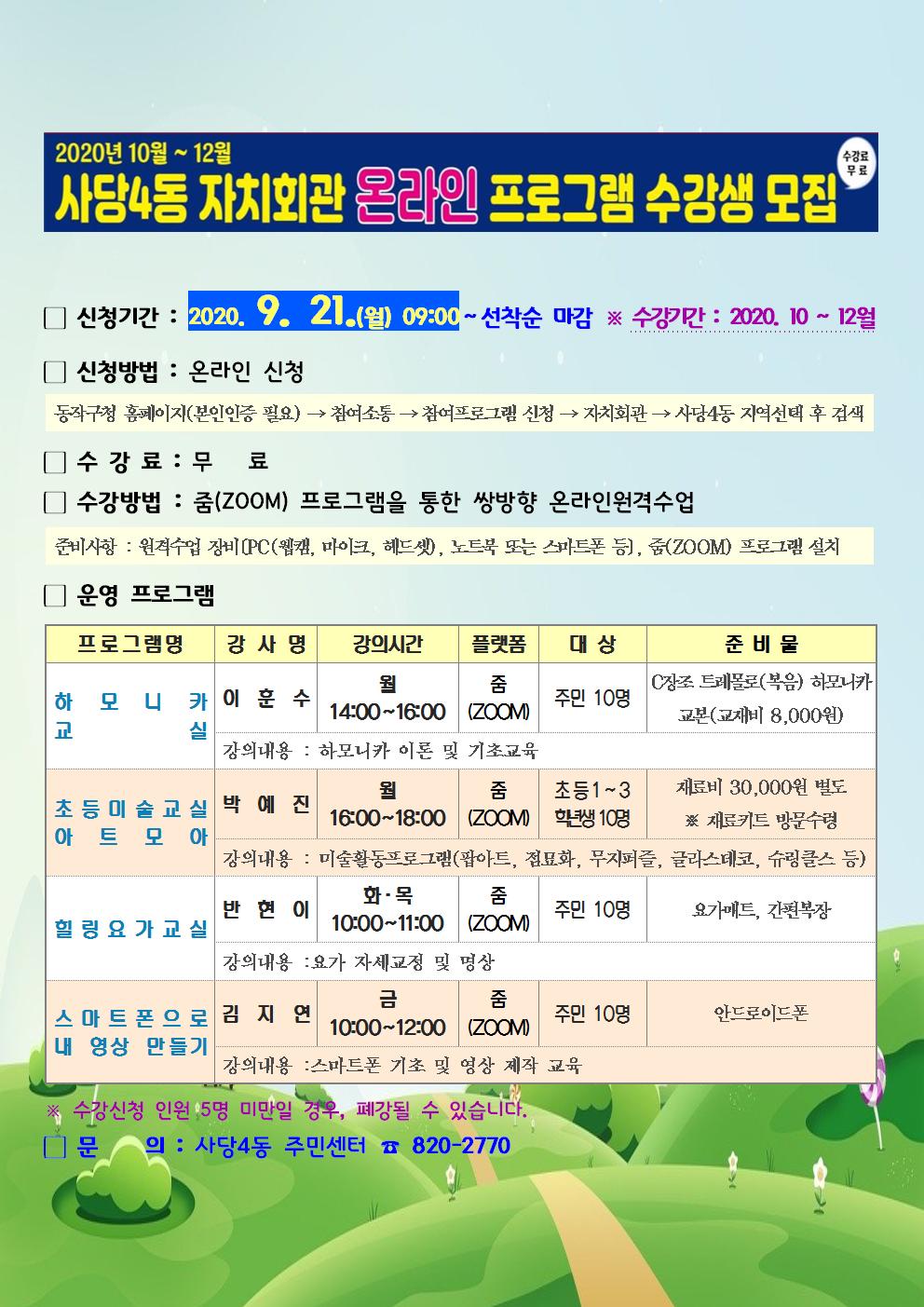 2020 사당4동 자치회관 온라인 시범운영 프로그램 수강생 모집 [2020.9.21(월) 09:00~선착순 마감, 동작구청 홈페이지에서 신청]