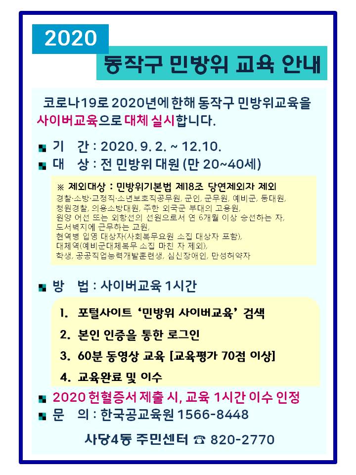 2020 동작구 민방위 교육 안내 (교육기간 : 2020.9.2.~12.10.)