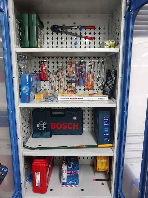 쇠지렛대 1, 다목적드릴비트세트 2, 장도리(망치) 1, 만능렌치 2, 기어라쳇렌치세트 1, 볼트커터 1, 수평계 1, 실리콘건 1,