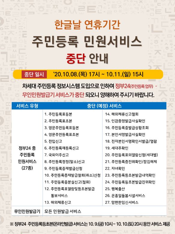 한글날 연휴기간 주민등록 민원서비스 중단 안내