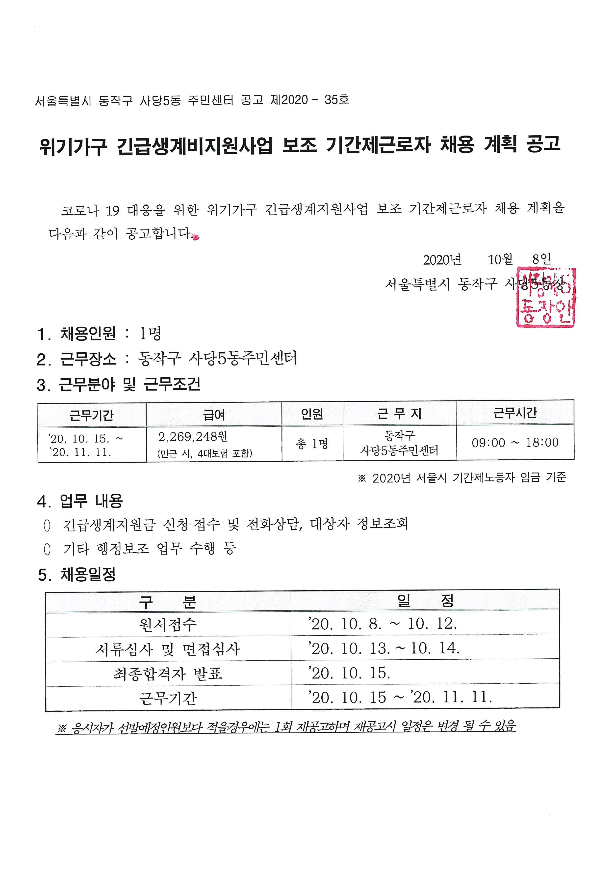 위기가구 긴급생계비지원사업 보조 기간제근로제 채용 계획 공고