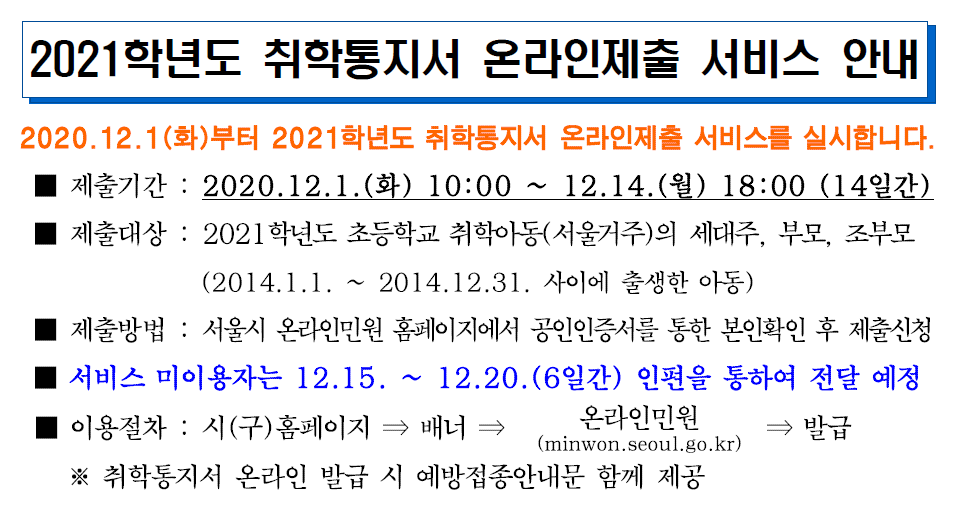 2021학년도 취학통지서 온라인제출 서비스 안내