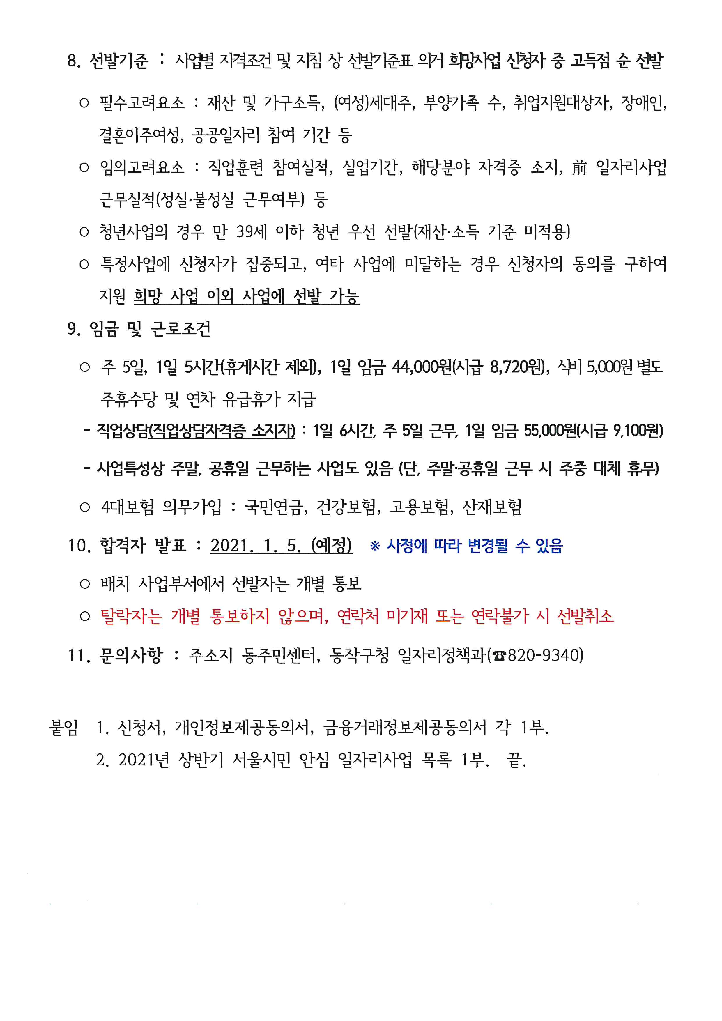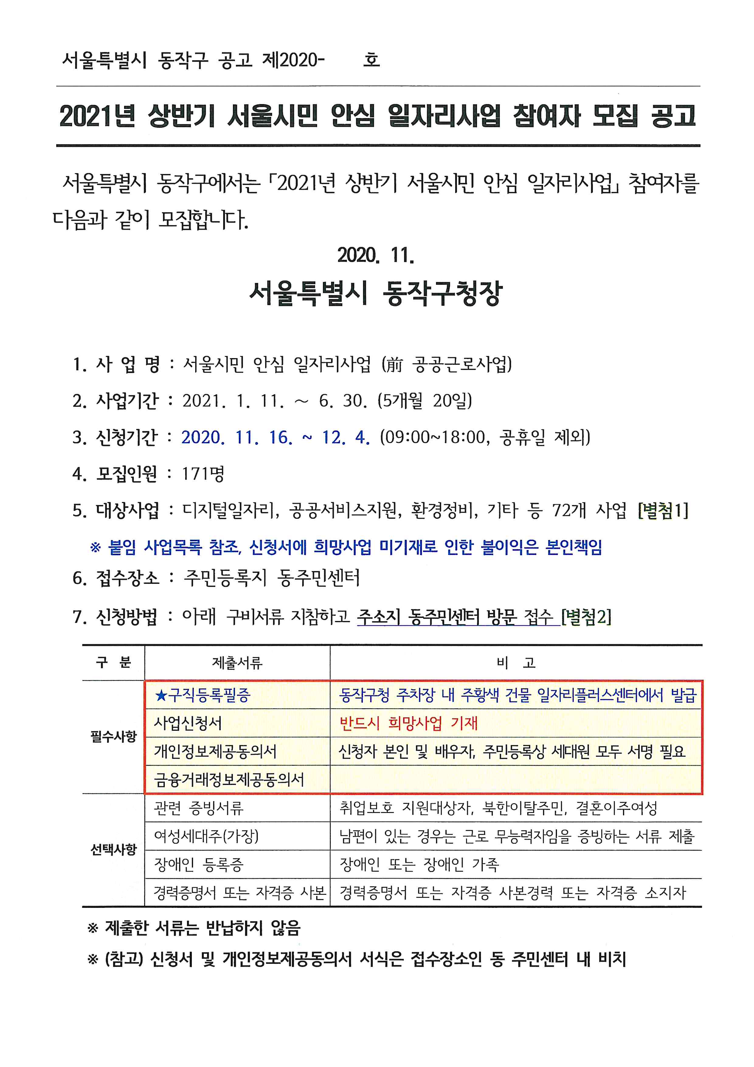 동작구와 서울시 2021년 상반기 서울시민 안심 일자리사업 모집을 병행으로 진행합니다.