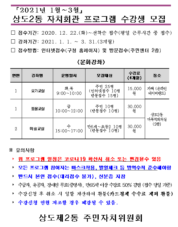 2021년 1월~3월 상도2동 자치회관 프로그램 수강생 모집 (*인터넷접수는 첨부문서 큐알코드로 접속가능)