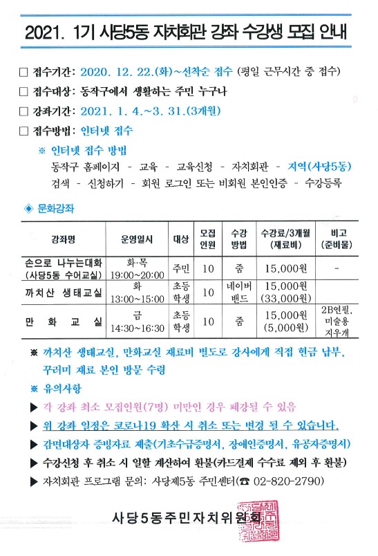 2021. 1월~3월 사당5동 자치회관 강좌 수강생 모집 안내