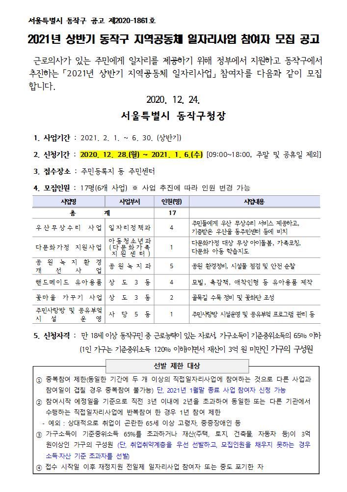 2021년 상반기 지역공동체 일자리사업 참여자 모집 공고