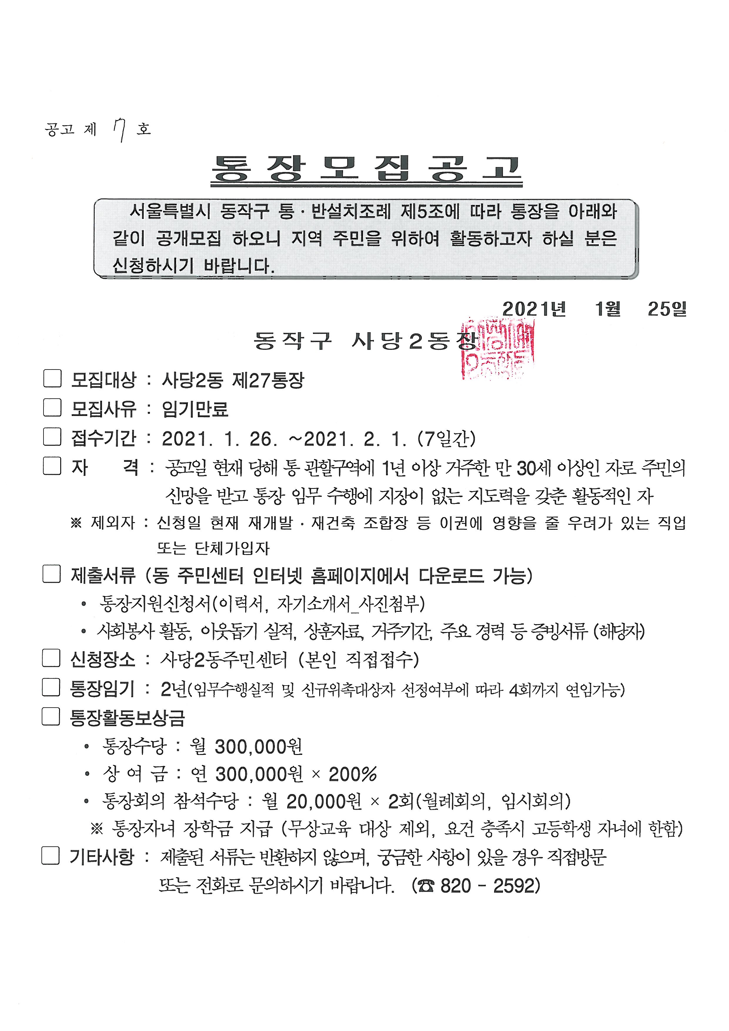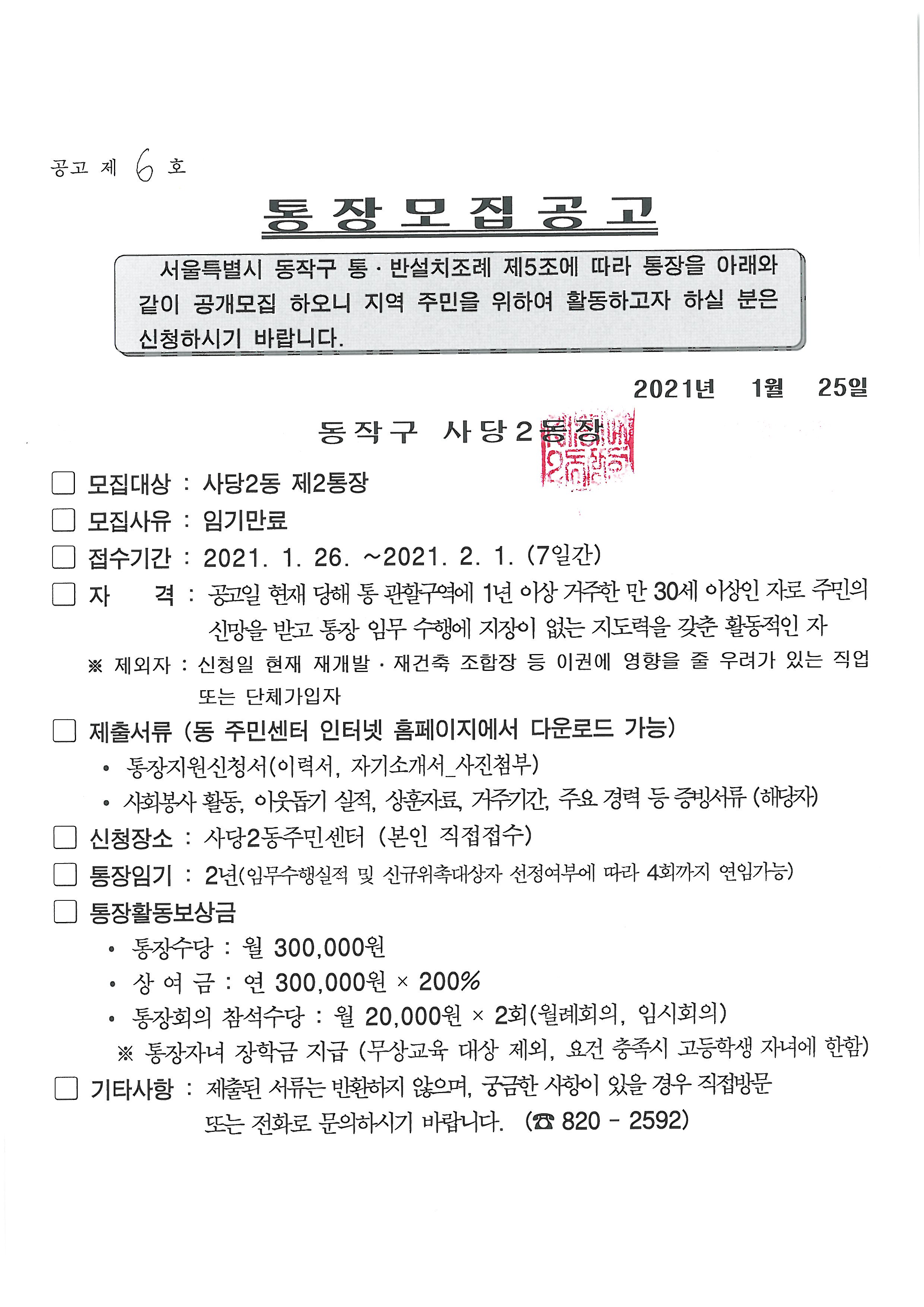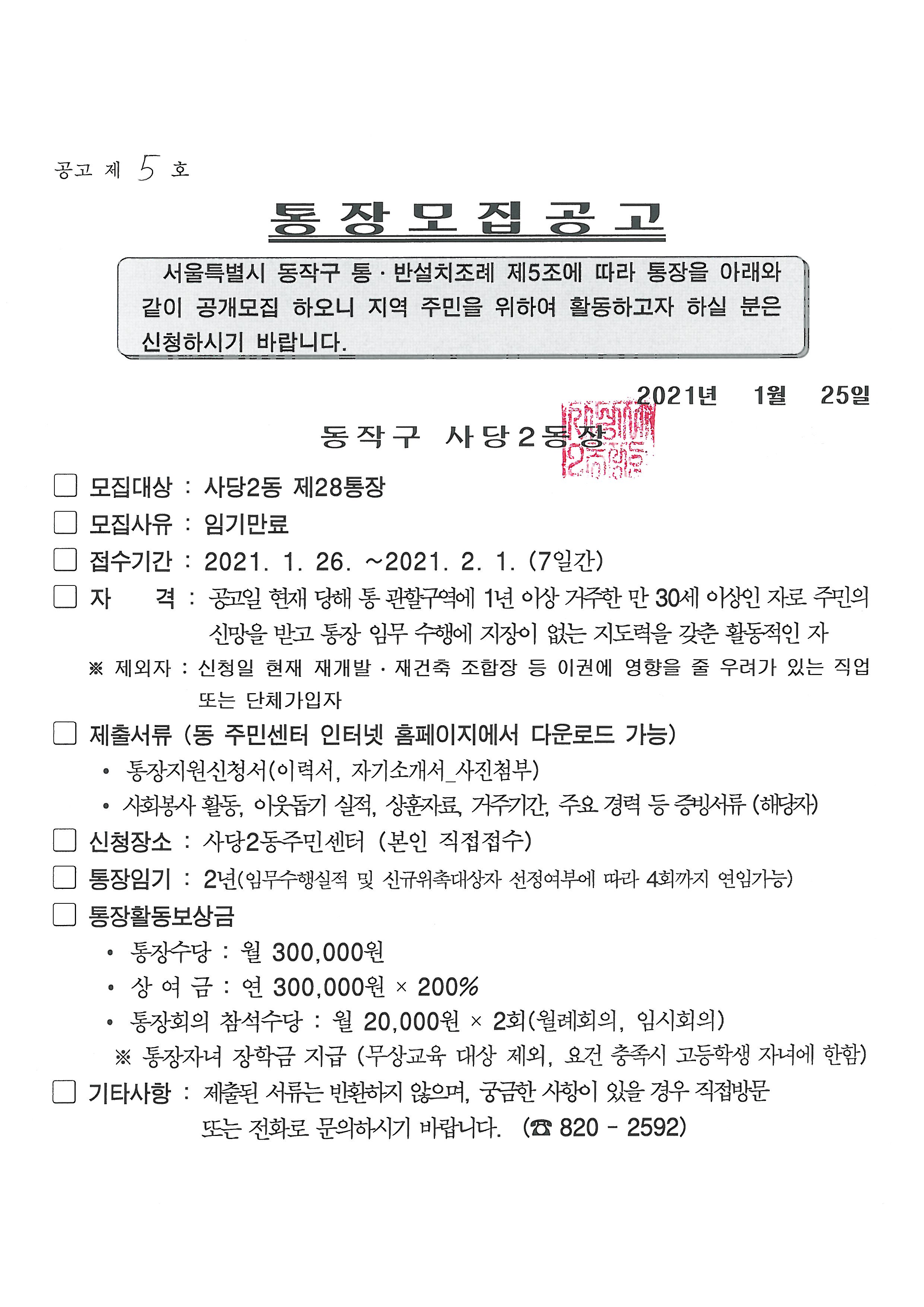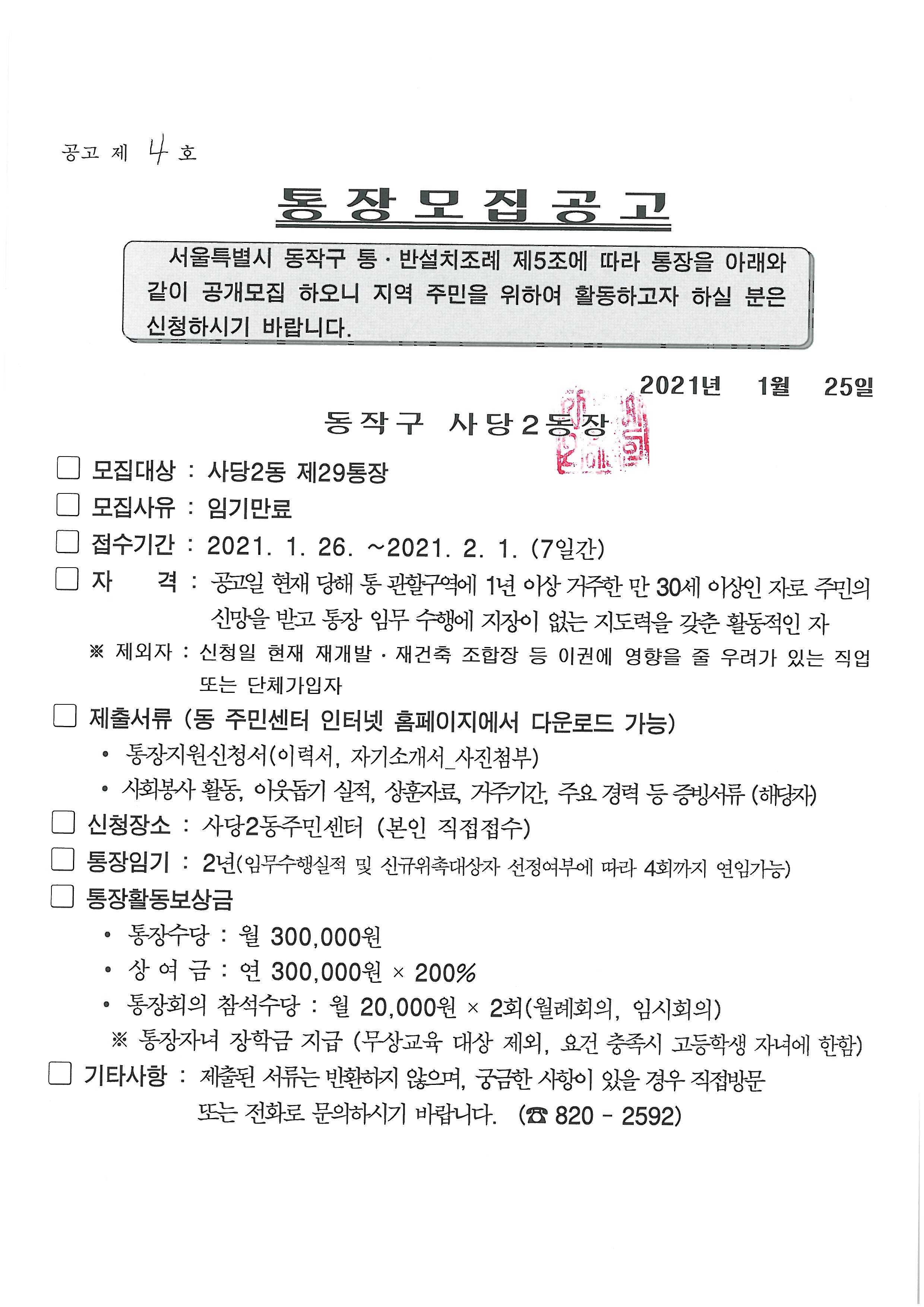 사당2동 통장 모집공고(2통, 27통, 28통, 29통)