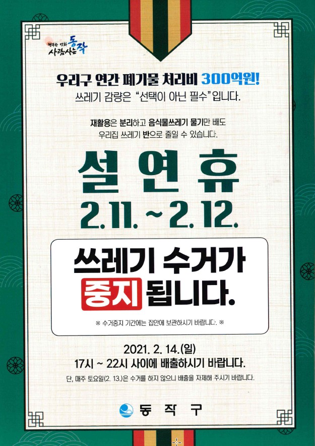 설 연휴 쓰레기 수거 중지 안내(2021. 2. 11.~2. 12.)