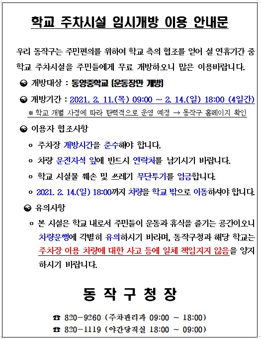 설 연휴 학교 주차시설 임시개방 안내