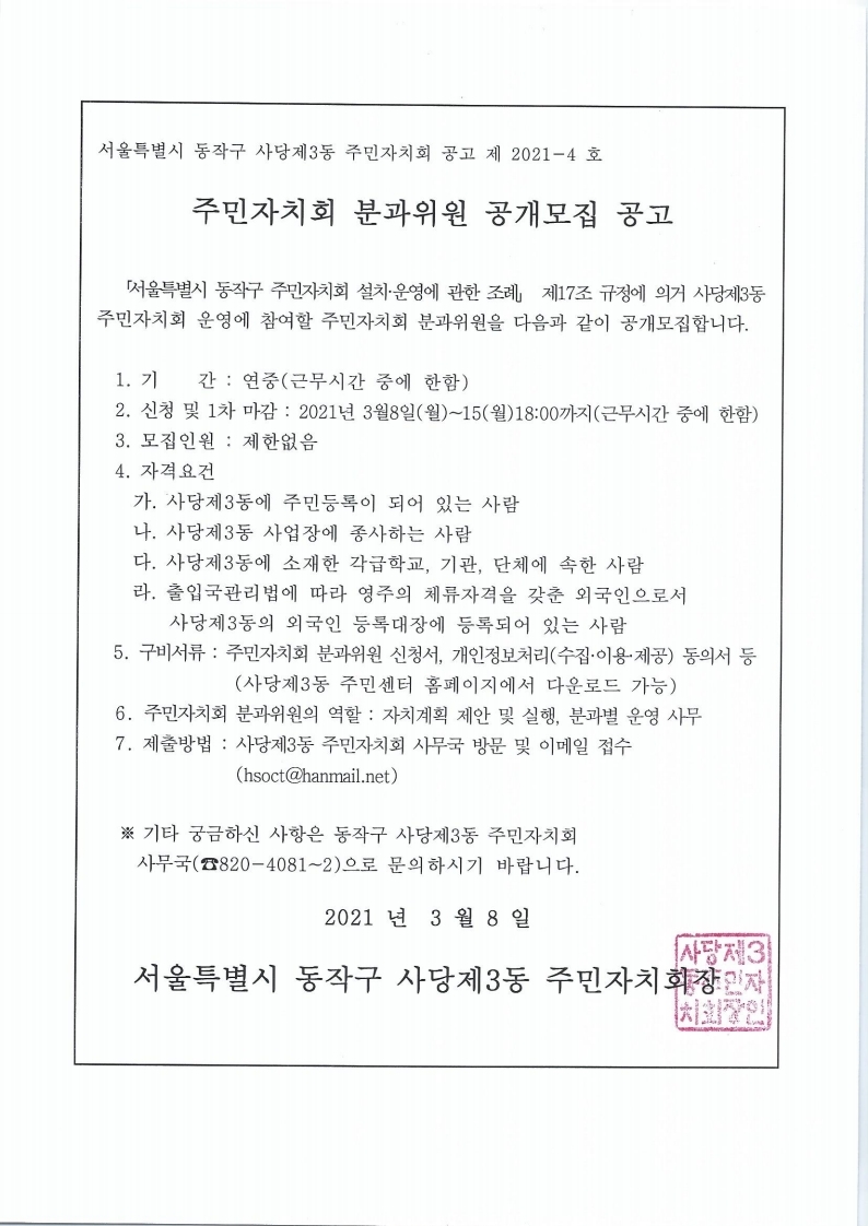 사당제3동 주민자치회 분과위원 공개모집 공고