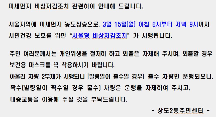 미세먼지 비상저감조치 발령 및 단계별 대응요령 안내(21.3.15.)