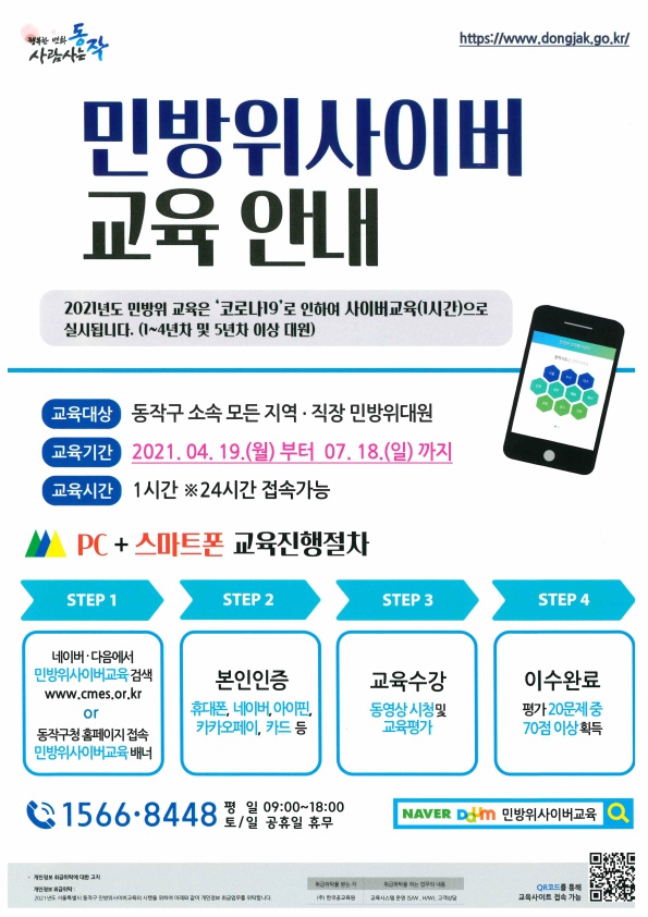 2021년도 민방위교육은 ‘코로나19’로 인하여 사이버교육(1시간)으로 실시됩니다. |