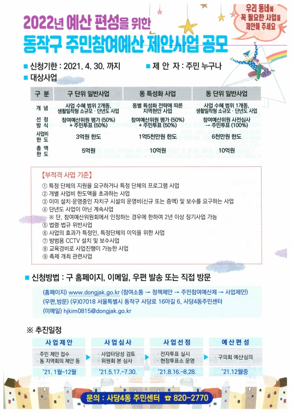 2022년 예산 편성을 위한 동작구 주민참여예산 제안사업 신청 안내 (2021. 4.30.까지)