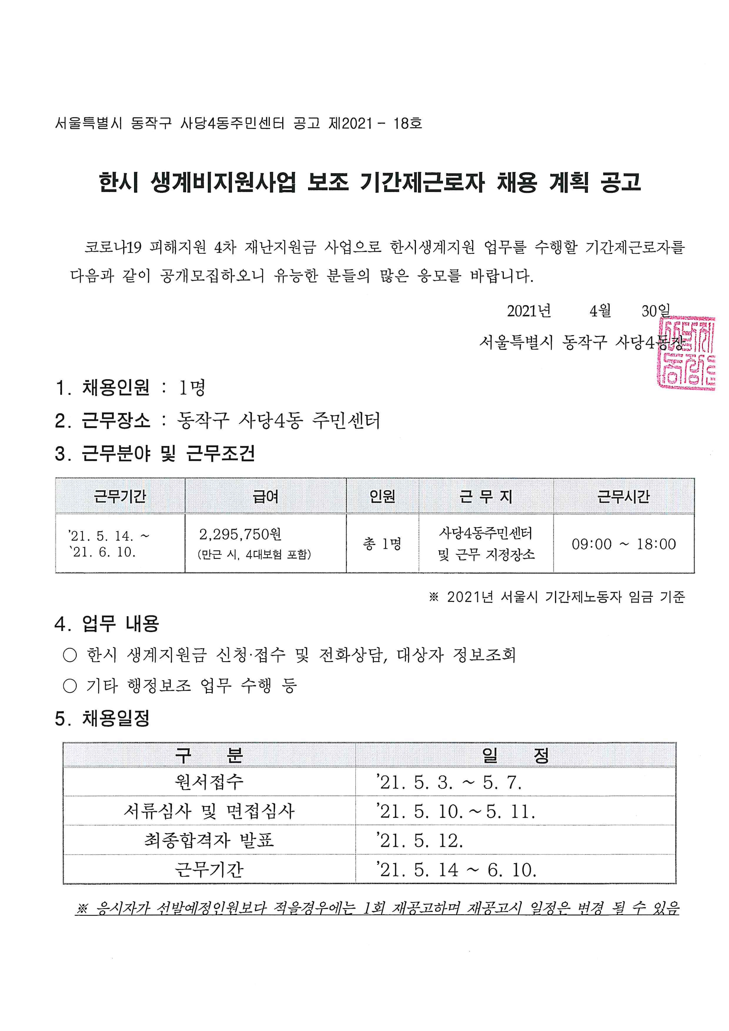 한시 생계지원사업 보조 기간제근로자 채용 계획 공고