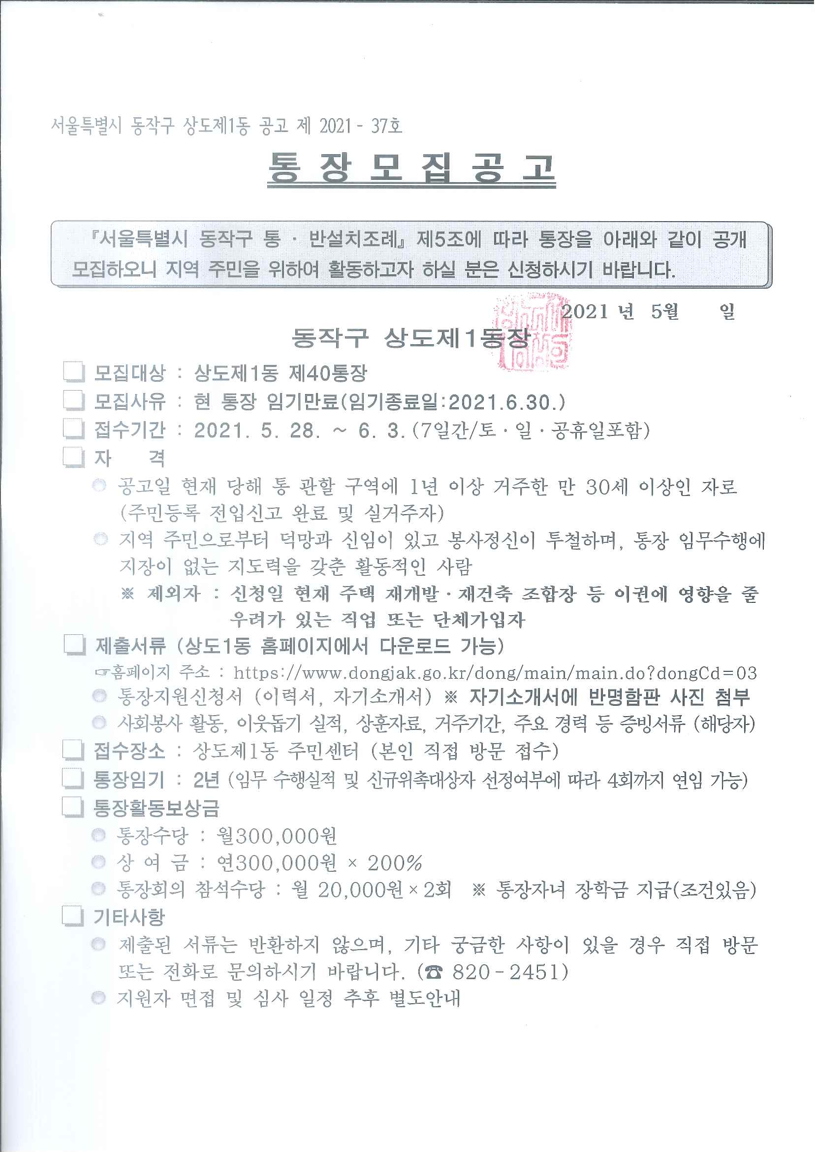 상도1동 통장 모집 공고(40통)