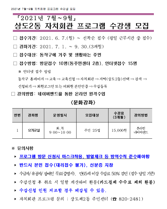 2021년 7월~9월 상도2동 자치회관 프로그램 수강생 모집