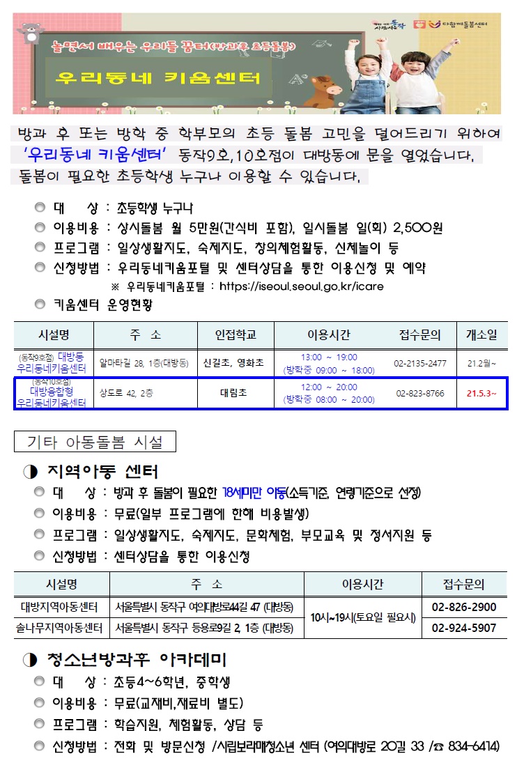 방과후 초등돌봄시설 "우리동네키움센터" 운영 홍보