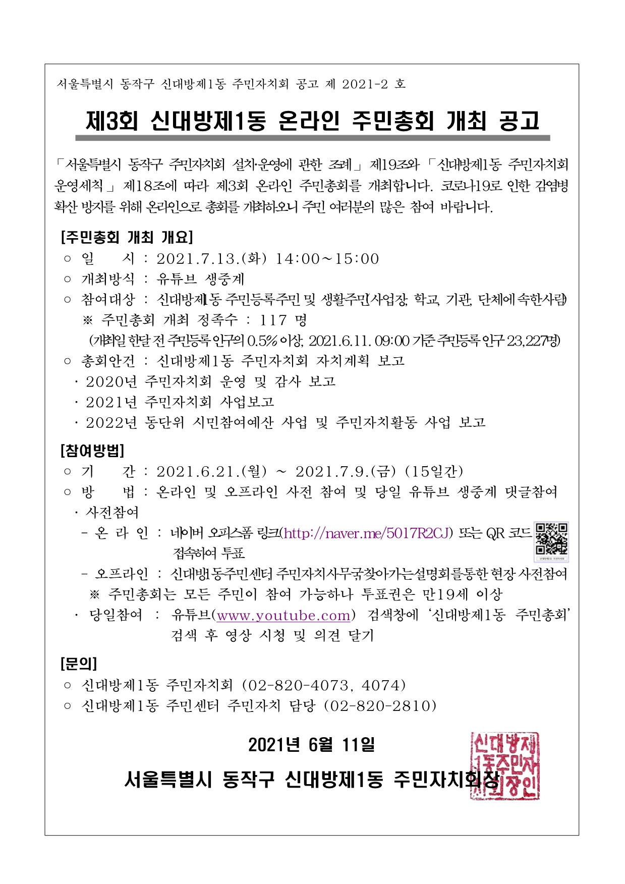2021년 제3회 신대방제1동 온라인 주민총회 개최 공고