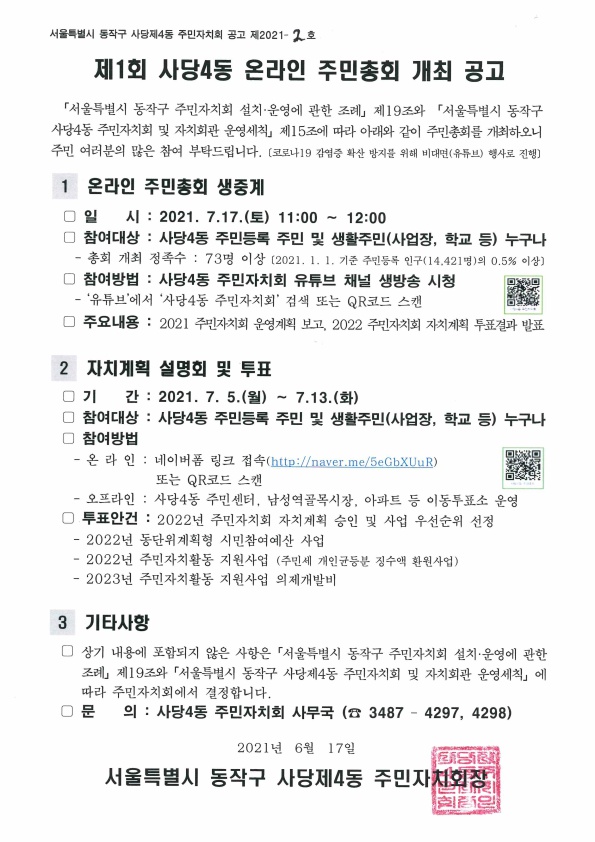 제1회 사당4동 온라인 주민총회 개최 공고