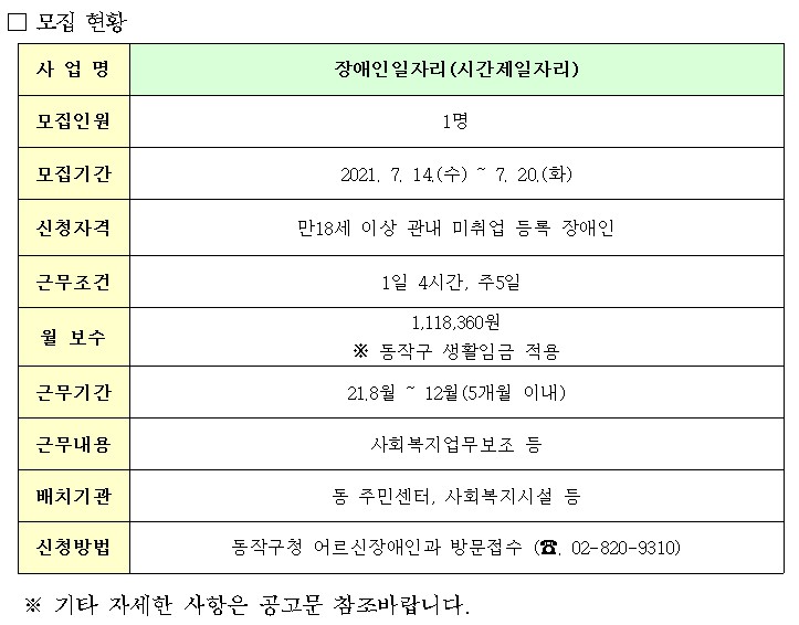 2021년 장애인일자리(시간제일자리) 참여자 추가 모집