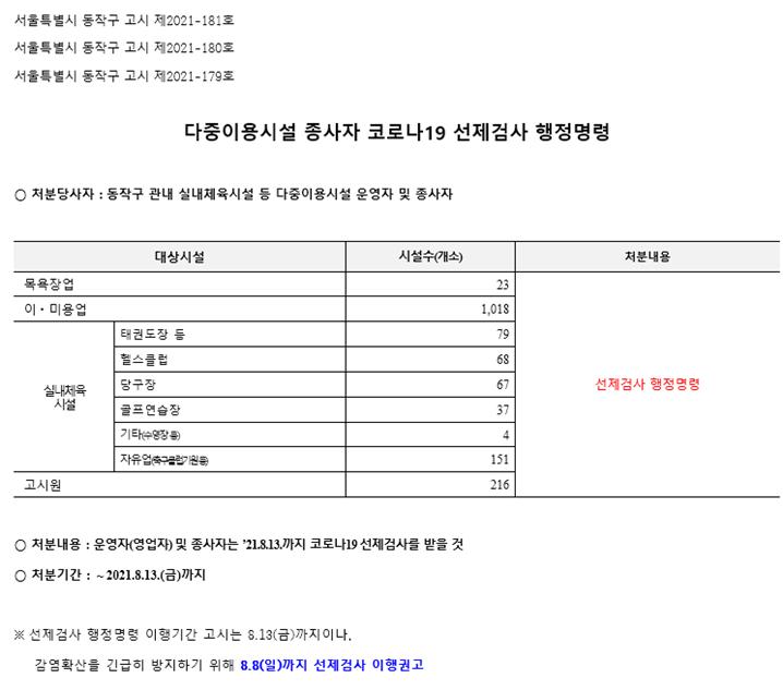 다중이용이설 종사자 코로나19 선제검사 행정명령