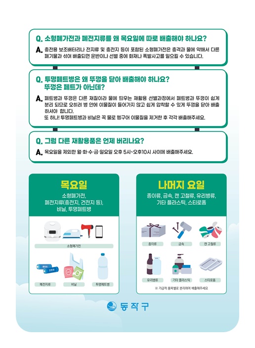 목요일은 소형폐가전, 배터리류, 비닐, 투명페트병'만' 배출해주세요!