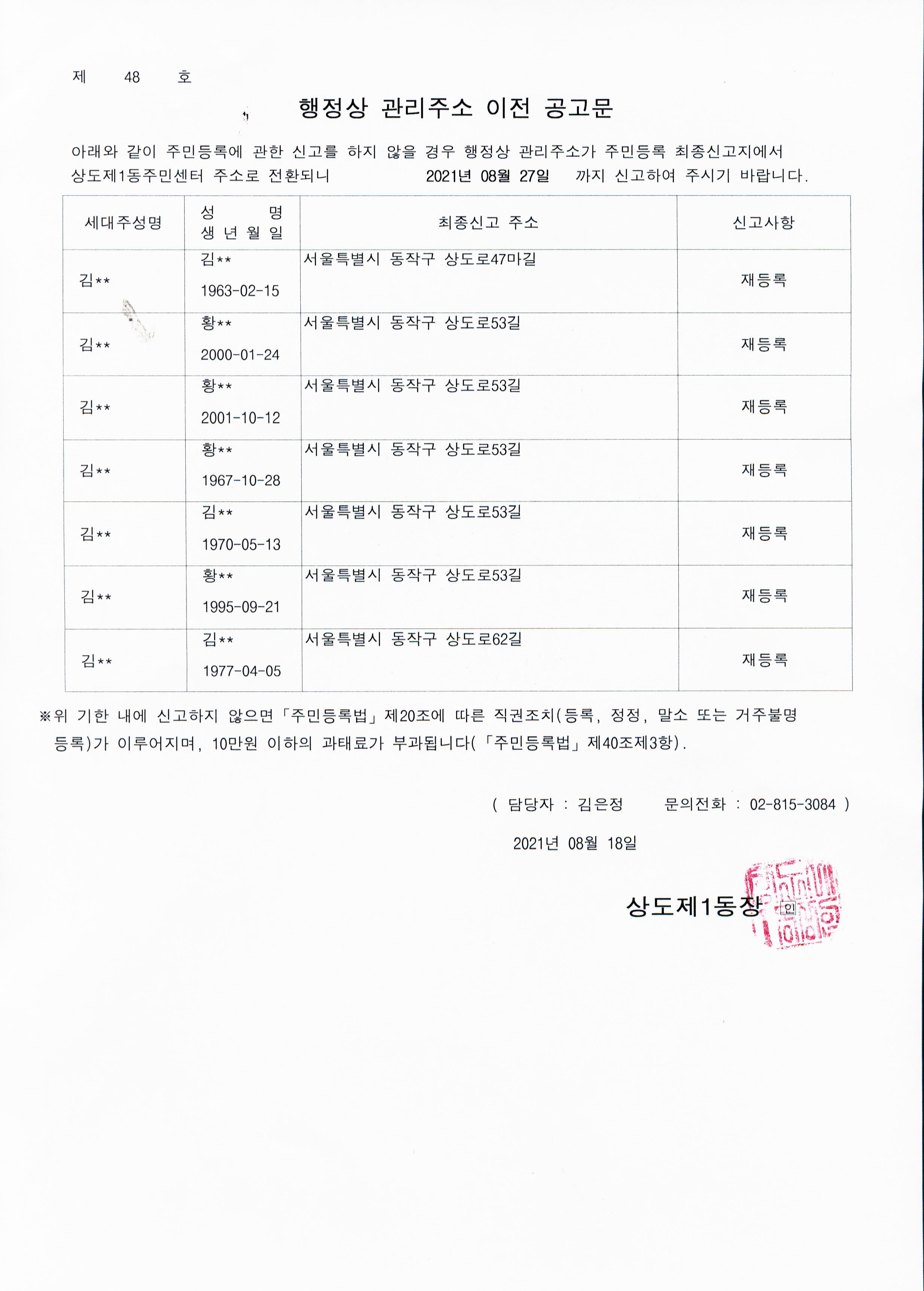 거주불명등록자 행정상 관리주소 이전2차 공고