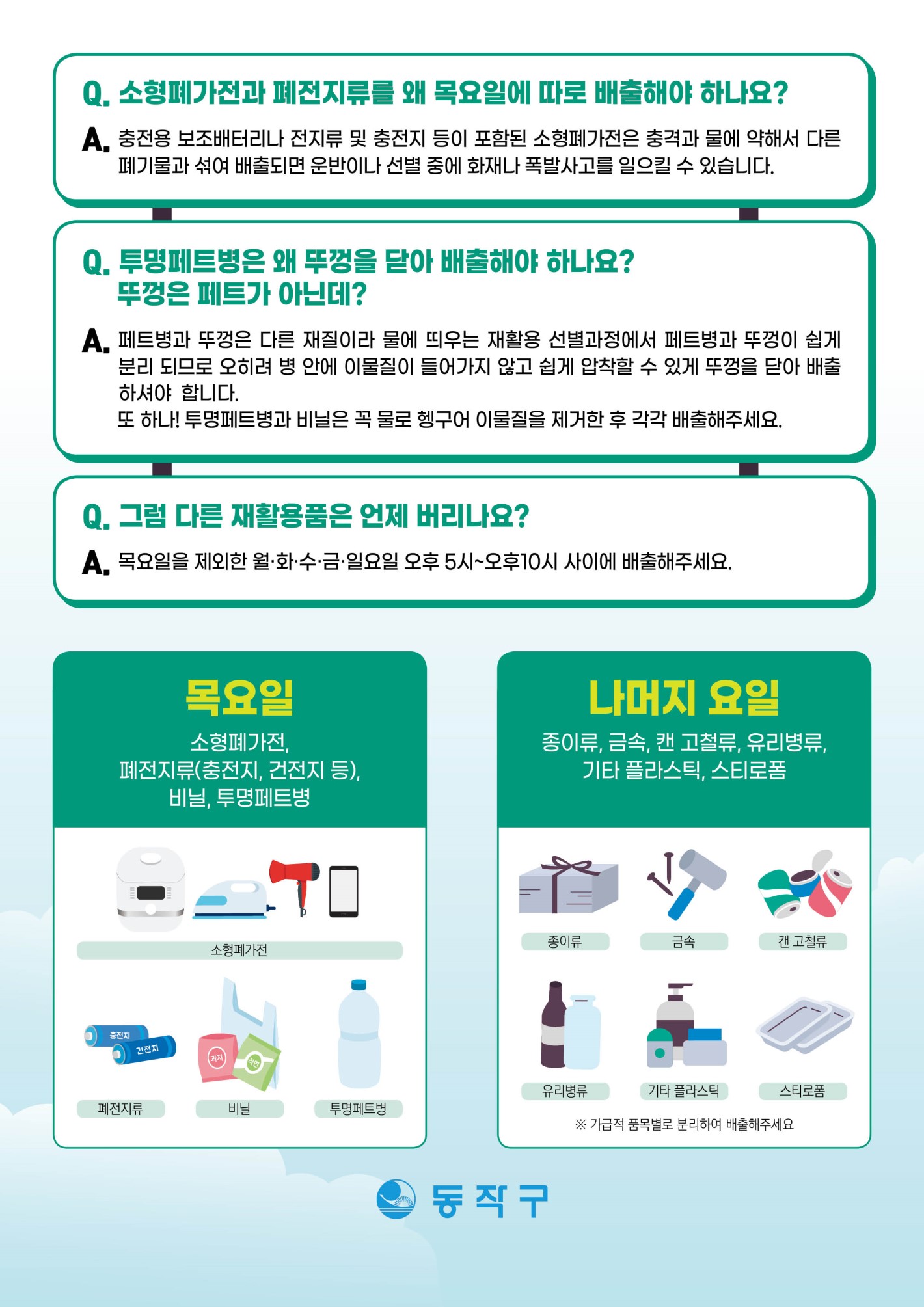 소형폐가전, 배터리류, 비닐, 투명페트병 목요일 배출 안내