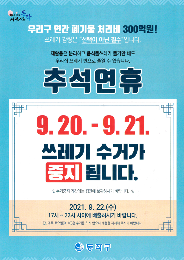 추석연휴 쓰레기 수거가 중지됩니다.(2021. 9. 20.~9. 21.)