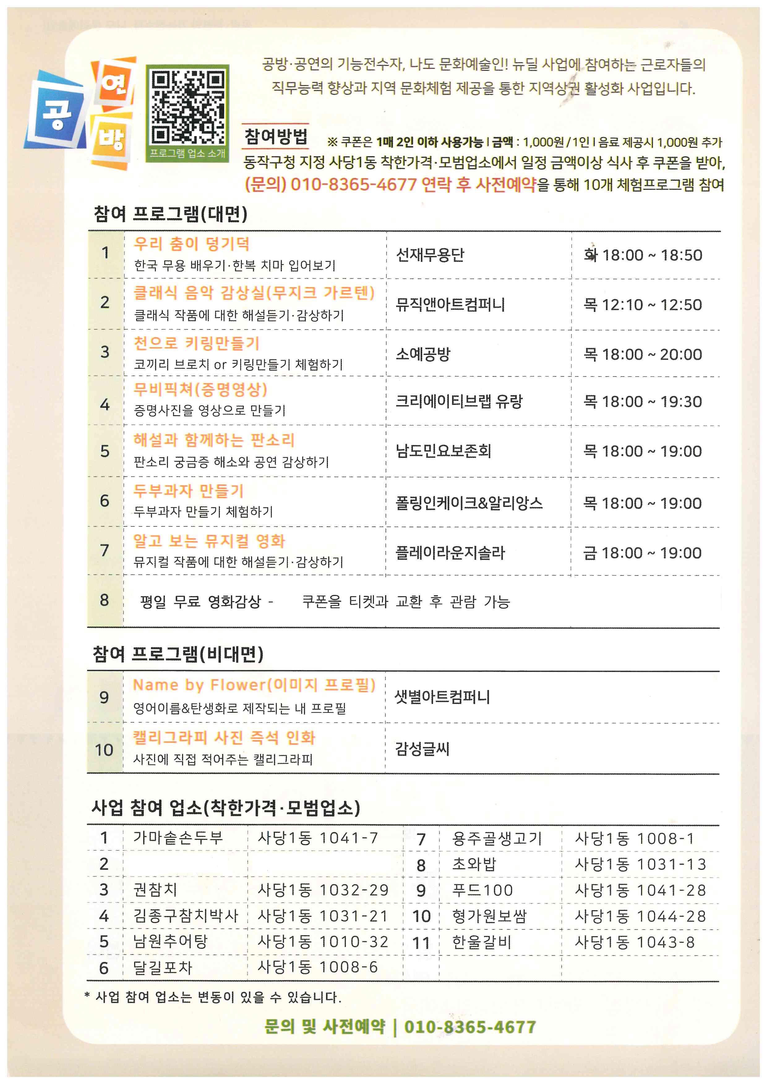 사당1동의 공방 및 공연장 + 착한가격 모범업소가 함께하는 「사당1동 예술놀이터 만들기」 사업을 소개합니다!