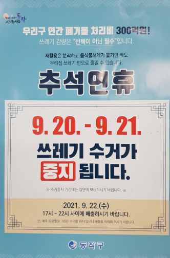 ○ 수거중지기간 : 2021. 9. 20.(월) ~ 9. 21.(화) [추석 :9.21.(화)]